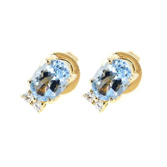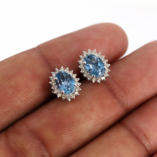 White Studs Studded Genuine Aquamarine & Round Stud Earring 14K Gold