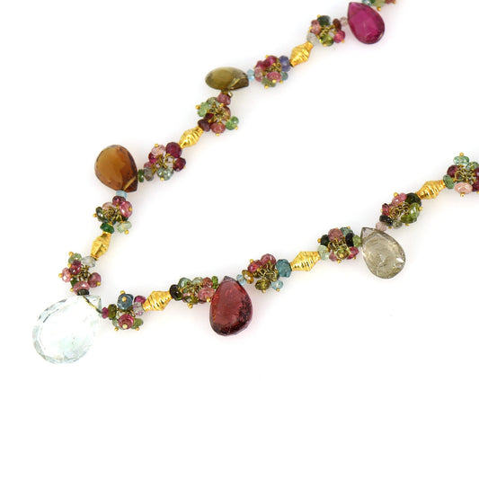 Solitaire Pear Cut Aquamarine Multi Tourmaline Beaded Necklace 18K Gold