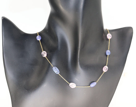 Yellow Chain Necklase Bezel Morganite Tanzanite Gem Stones. Multi Colour Chain Chain 18 Inches Handcrafted. 18K Gold