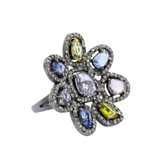 White Blue Pink Sapphire & Vintage Two Stone Bypass Ring 18K Gold