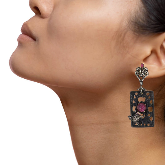 Victorian Jewellery Ruby Glass Filled Black Onyx & Earring