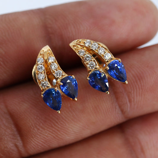 Yellow Studded Pear Cut Blue Sapphire Studs Top Quality Round Earring 14K Gold