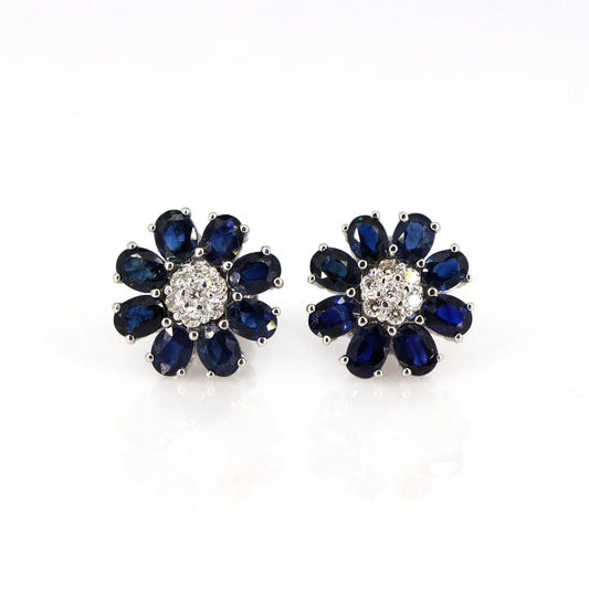 Yellow Studded Oval Cut Blue Sapphire Studs Top Quality Round Earring 18K Gold