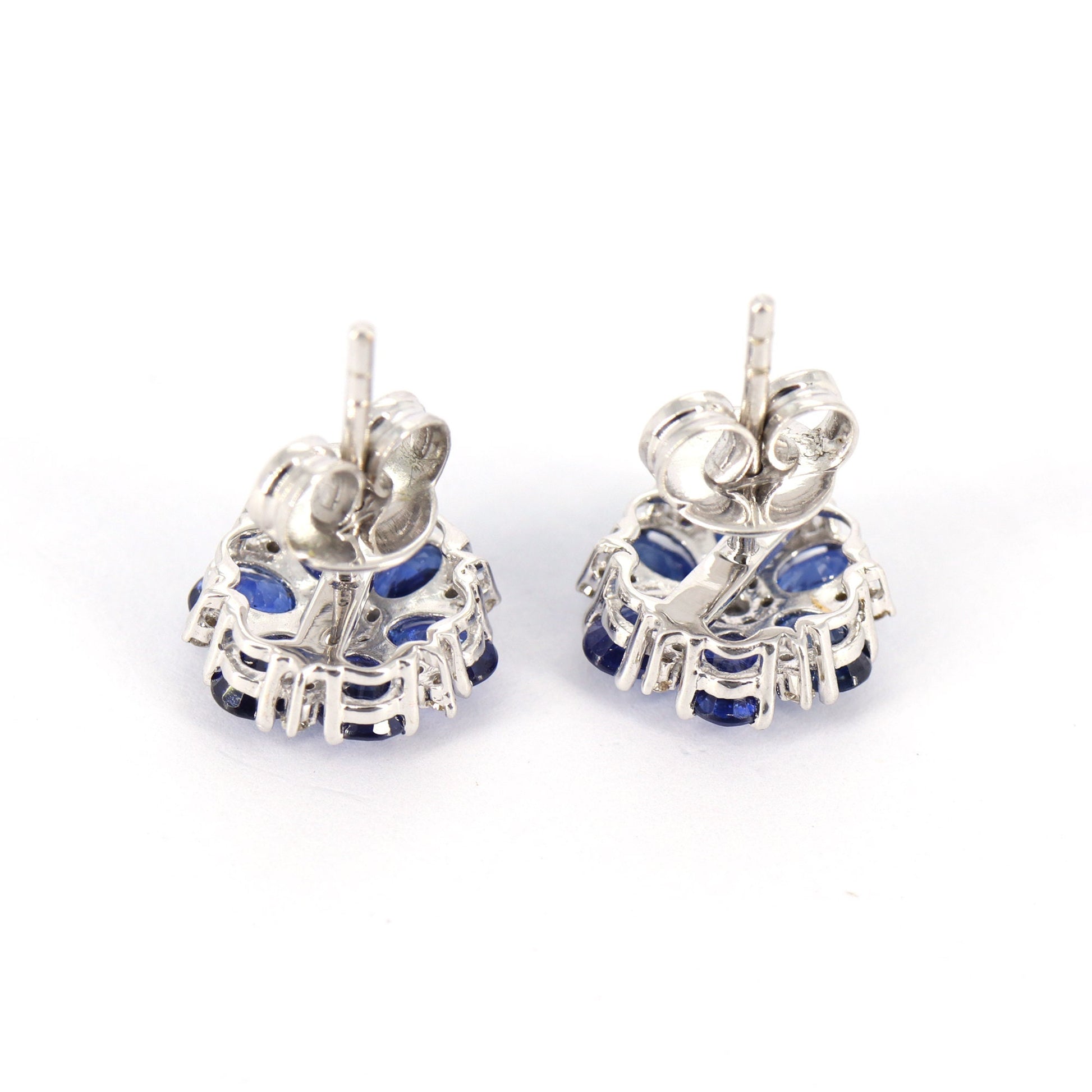 18K Solid White Gold Studded with Blue Sapphire Earrings , Flower Design Earrings, Natural Stone Earrings, For Her, Natural Diamonds