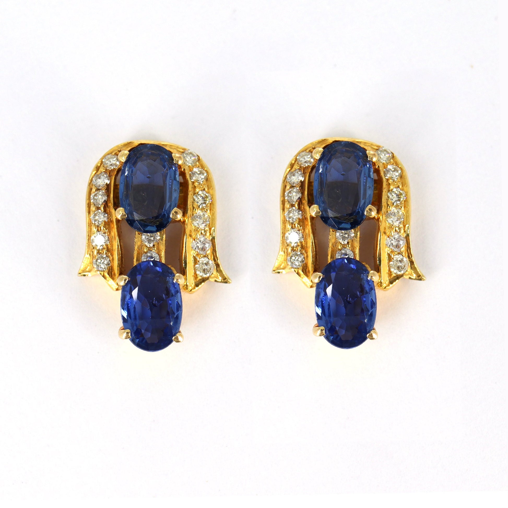 18K Solid Yellow Gold Studded with Oval Cut Blue Sapphire Studs, Top Quality Round Diamond Earrings, For Her, Unique Design Earrings
