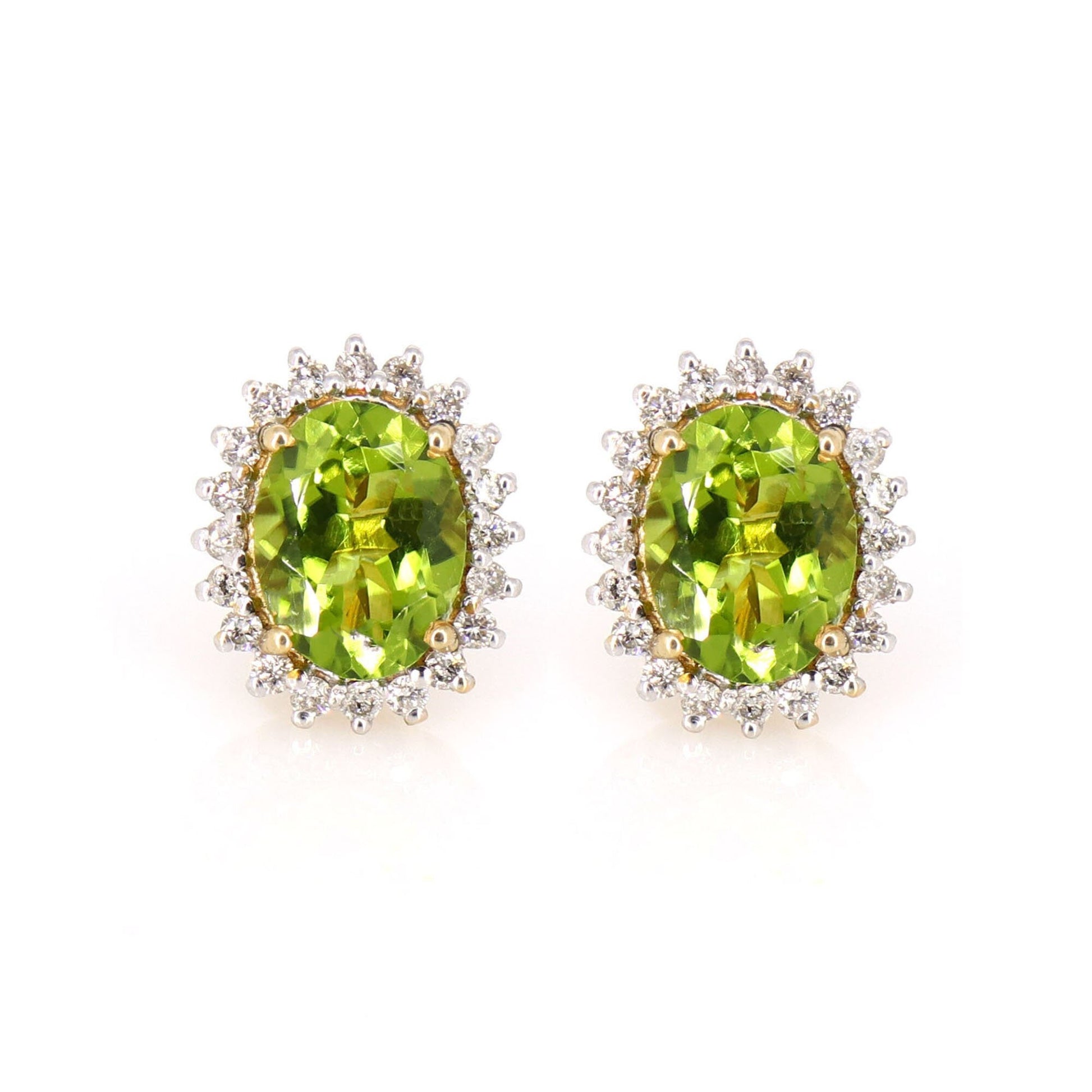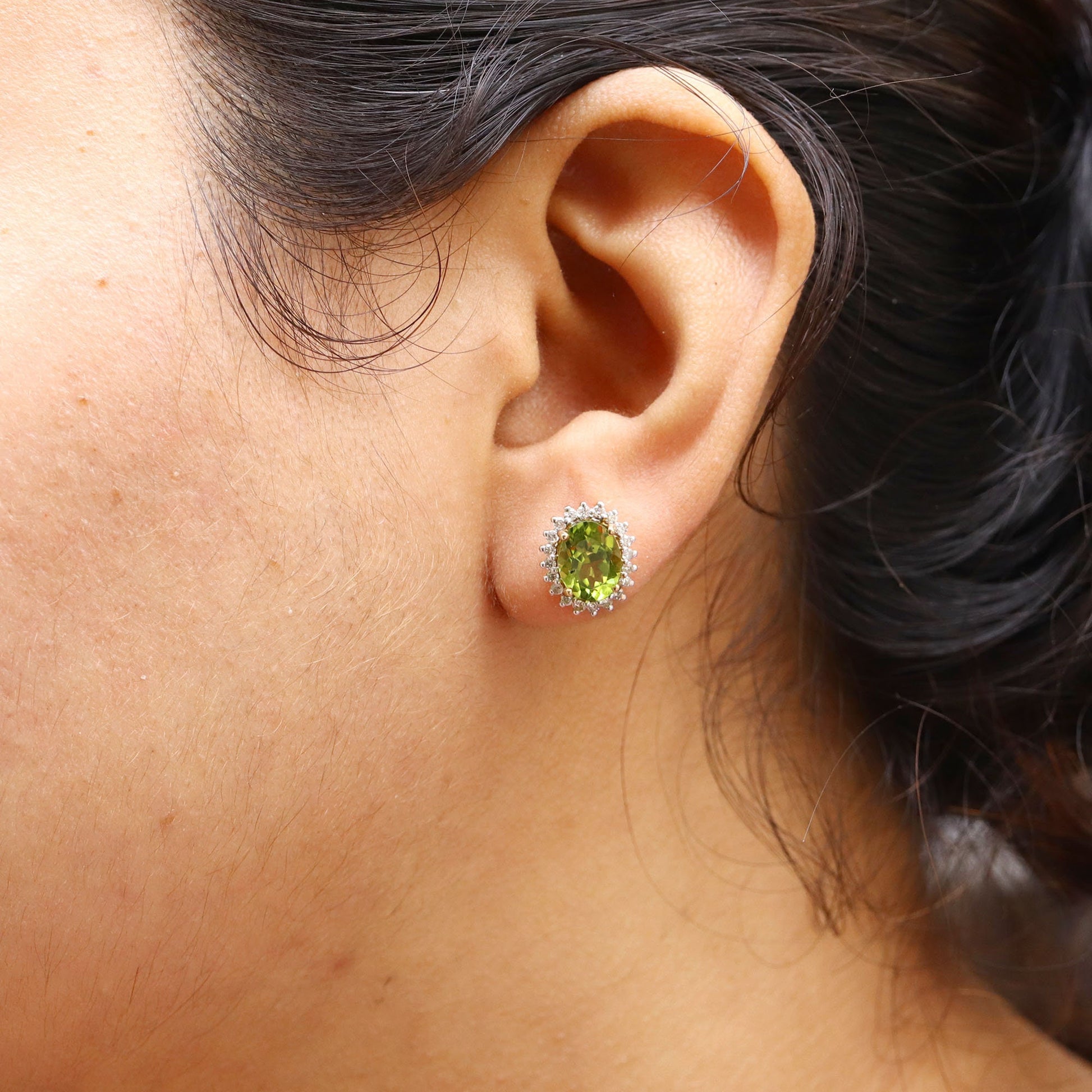 3.61ct Natural Peridot Earrings, Peridot Diamond Stud Earrings, Cluster Setting Gemstone Studs, Halo Earrings, Oval Studs, Bridal Earrings