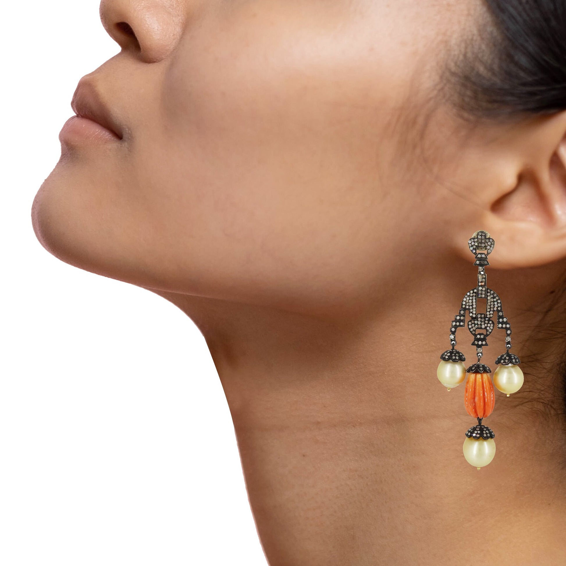 Coral Carving Gemstone, South Sea Pearl Earrings, Unique Style Victorian Earrings, Carving Coral & Pearl Earrings, Diamond Jewellery,