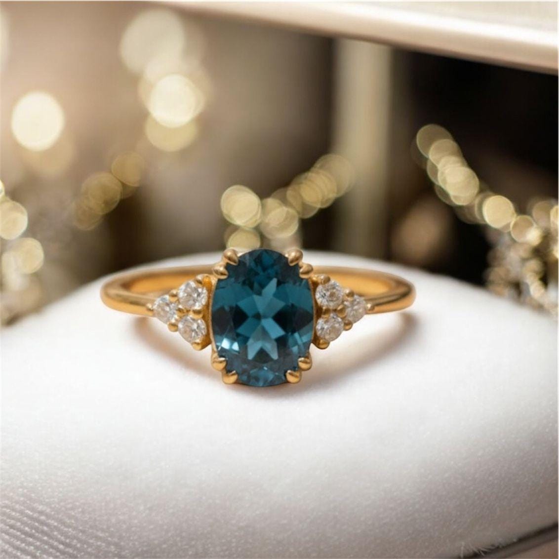 London Blue Topaz Ring | Oval Cut Diamond Cluster 14K Solid Gold Engagement Ring | December Birthstone Unique Promise Ring Anniversary