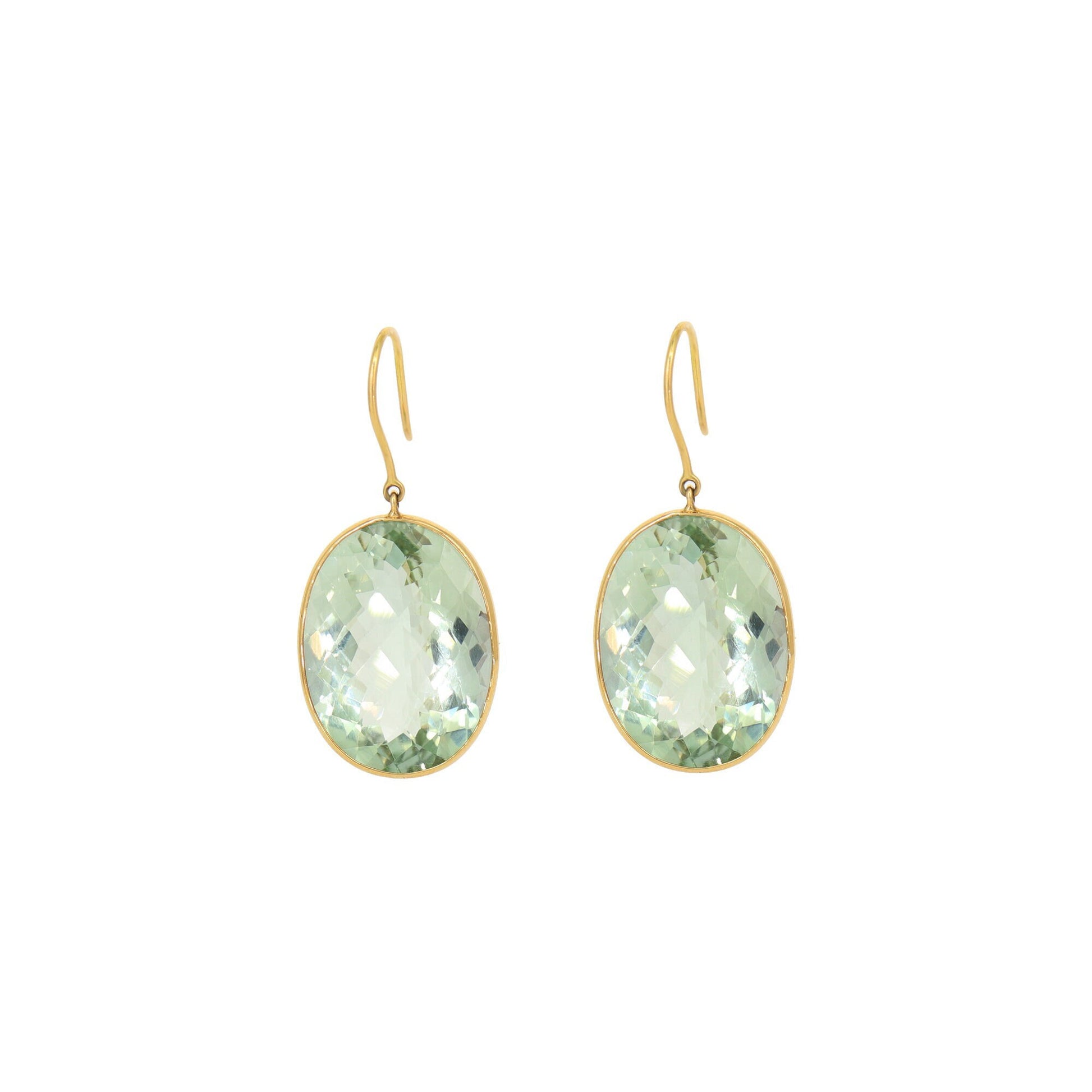 Natural Green Amethyst Earrings in 18k Solid Yellow Gold Bezel Set, Oval Shape On Front Checker Cut Green Amethyst Dangling Earrings