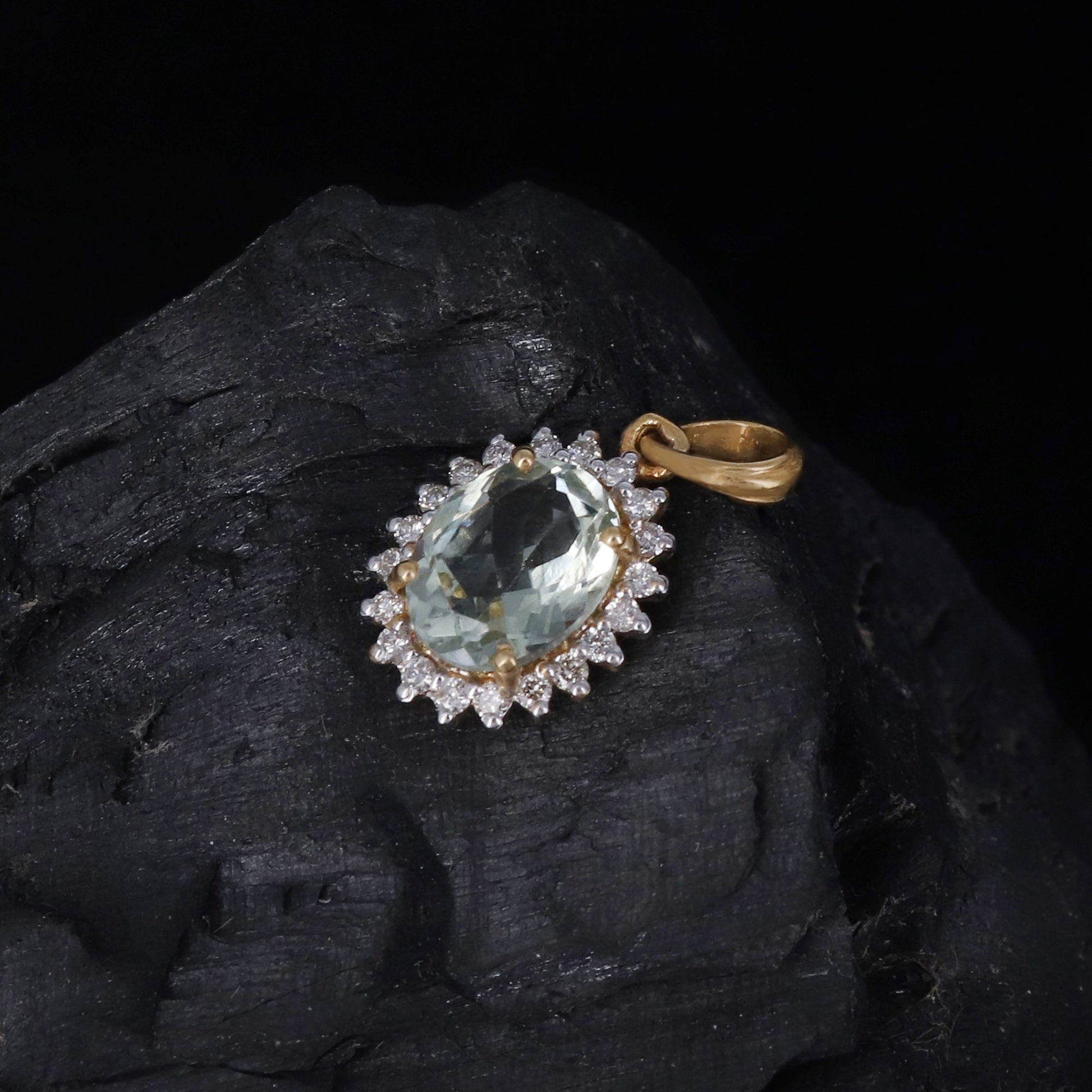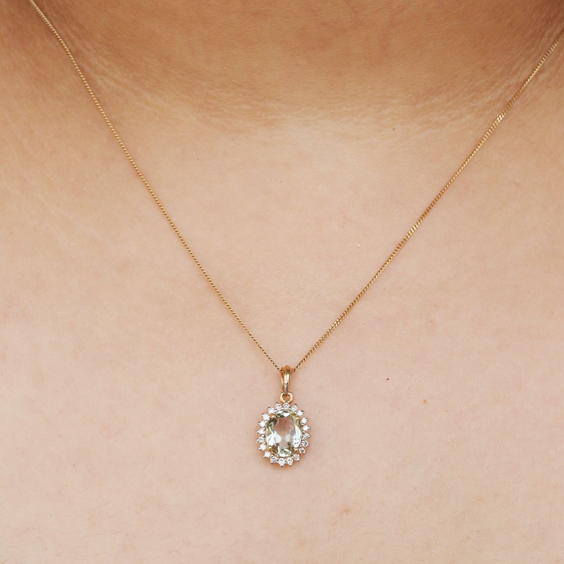 Natural Green Amethyst Pendant, Halo Pendant With Diamond Accents, 14k Solid Yellow Gold, Diamond Necklace, Green Amethyst Charming Pendant