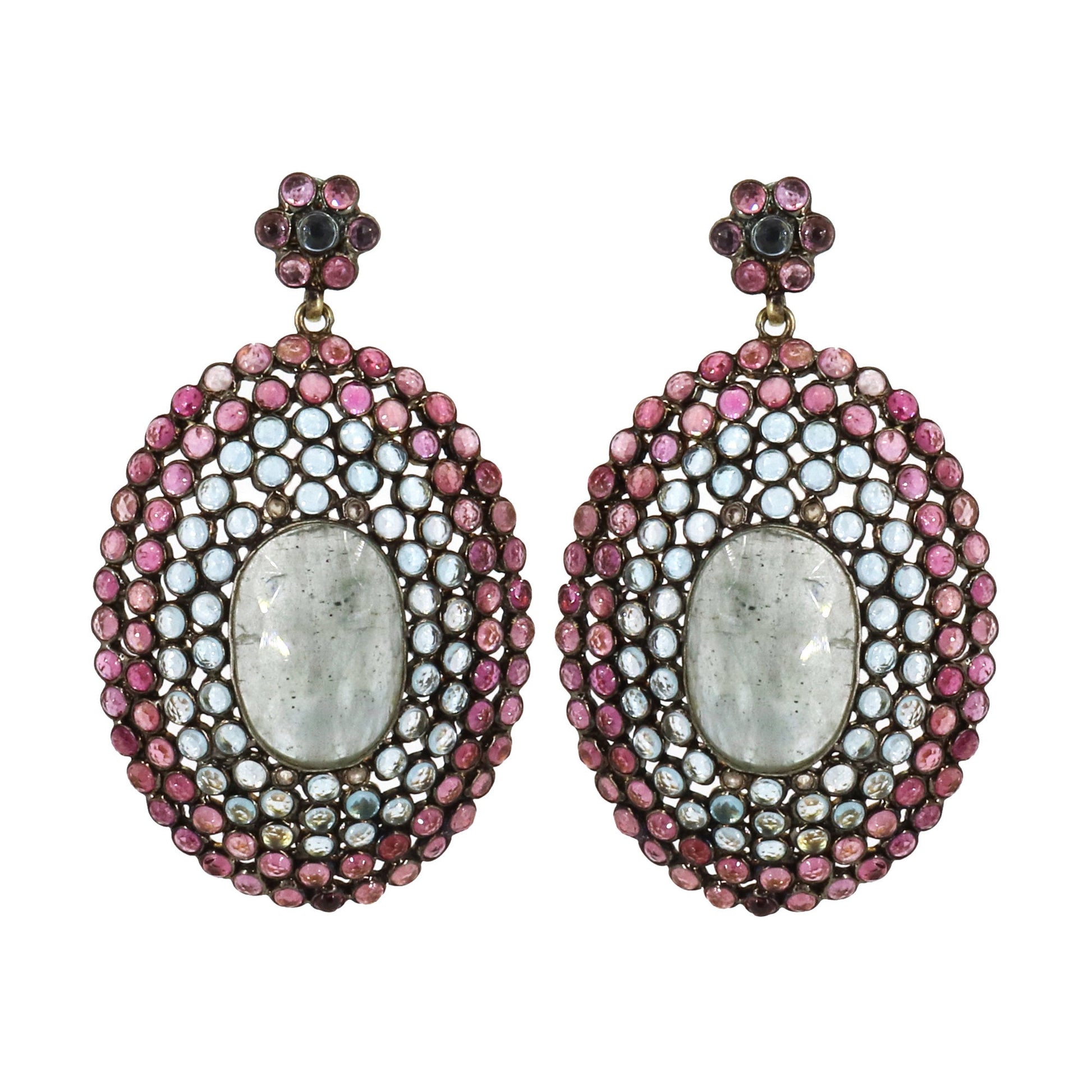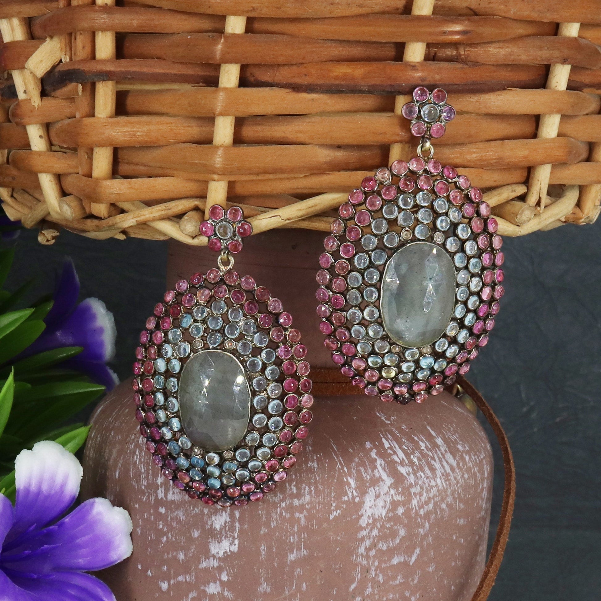 Natural Pink Tourmaline, Natural Blue Topaz and Color Gemstone, Dangle Earrings, Round & Oval Shape Gemstone, Victorian Diamond Earrings