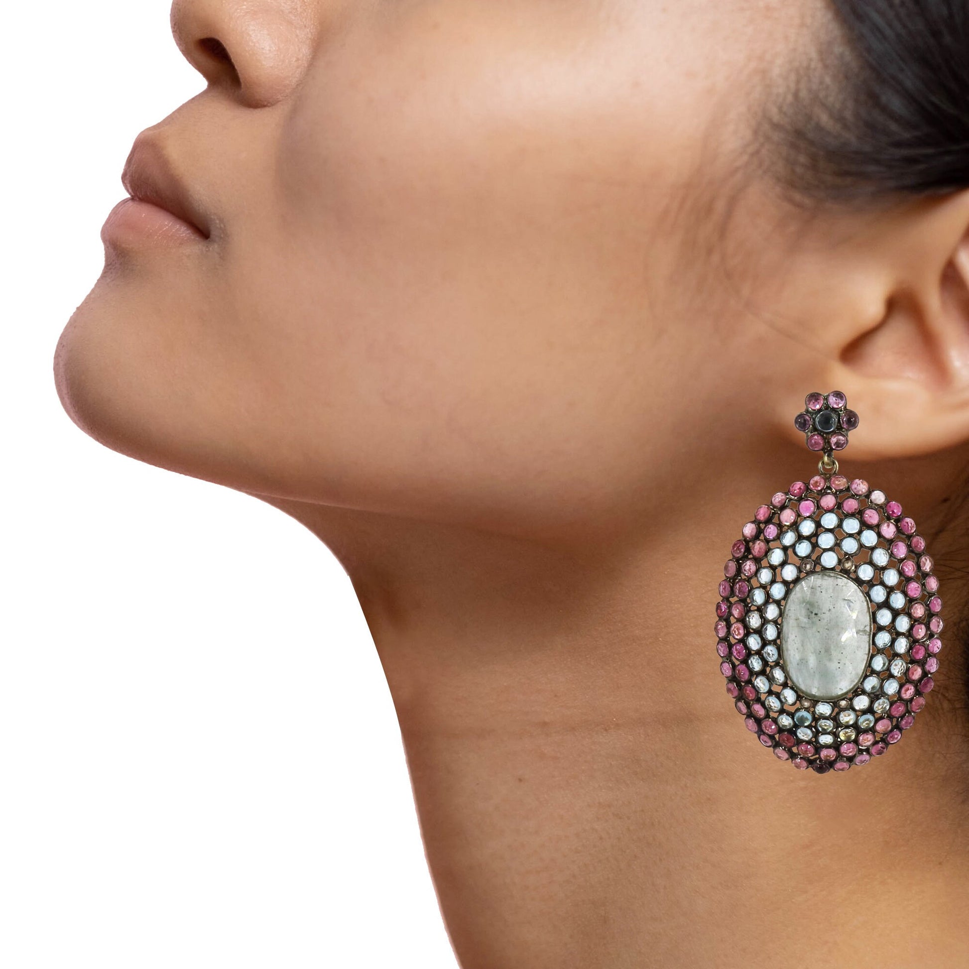 Add this beautiful handcrafted Victorian earrings studded with natural Pink Tourmaline, Natural Blue Topaz, Color Gemstone and natural Diamonds to your jewellery collection. This earring is one of the copy of old styles from Victorian time, which can be worn as a designer or markable style.