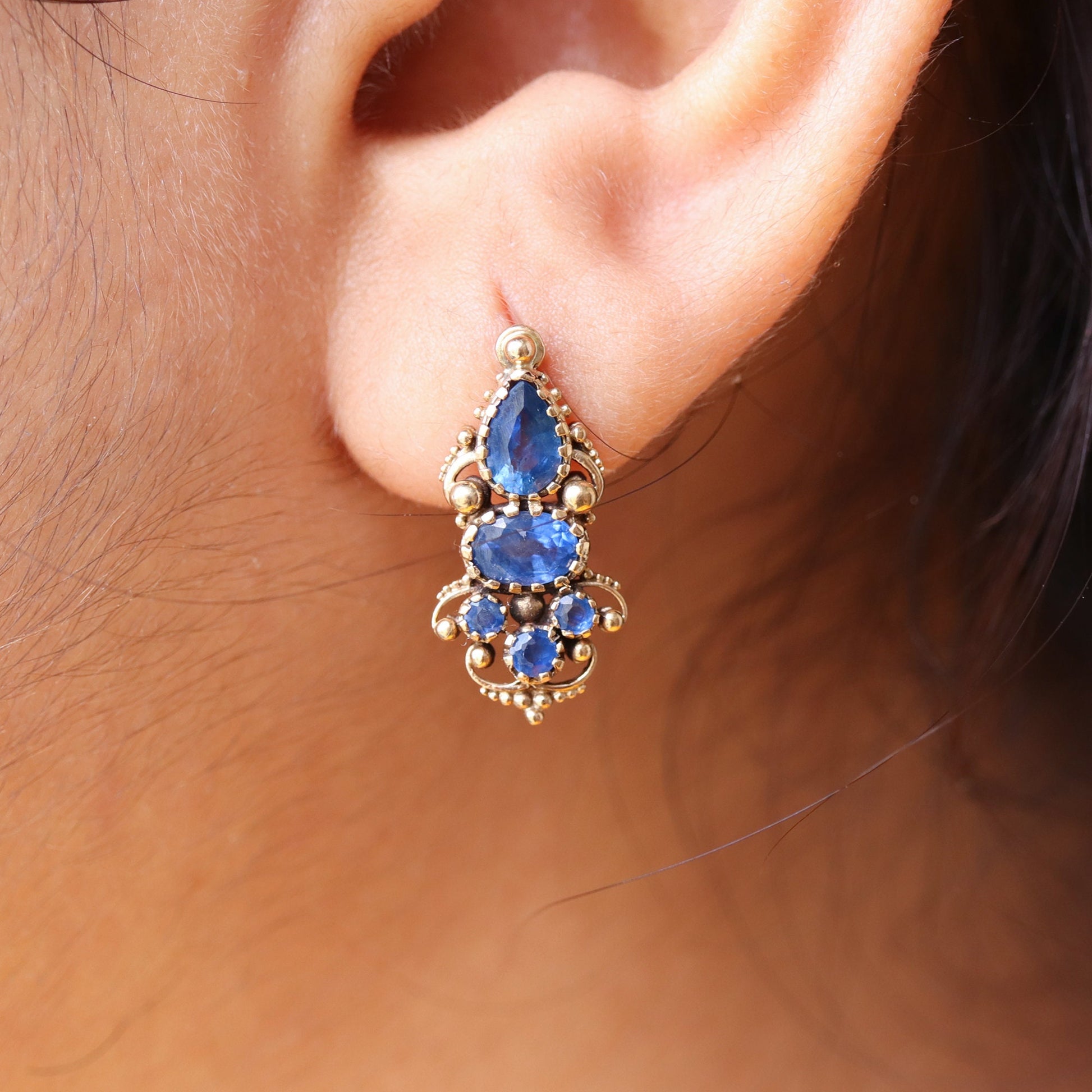 Pear, Oval & Round Cut Natural Blue Sapphire Gemstone Earrings, 9k Solid Yellow Gold Earrings, One of a kind Yellow Gold Jewellery