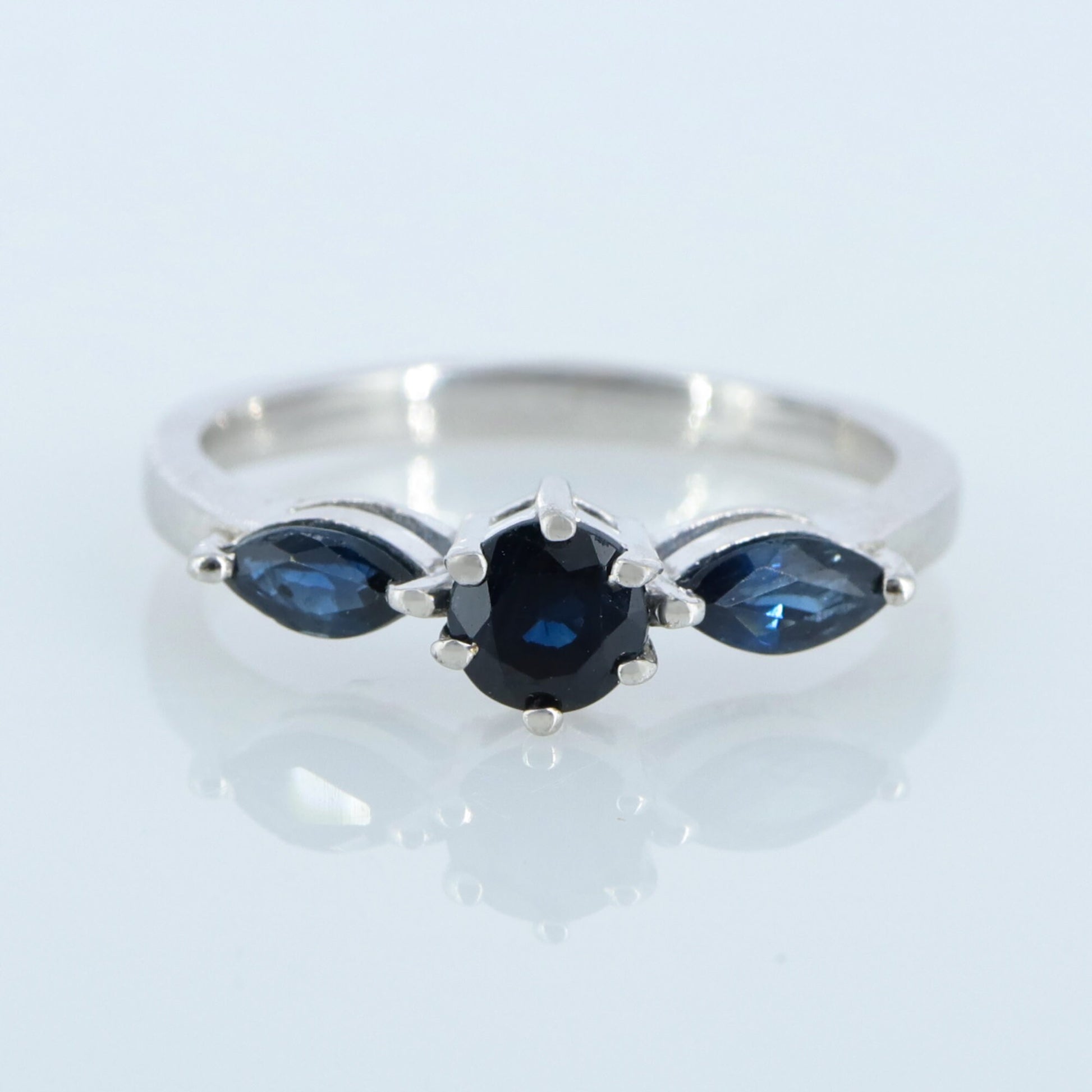 Round & Marquise Cut Gemstone Genuine Blue Sapphire Ring Silver